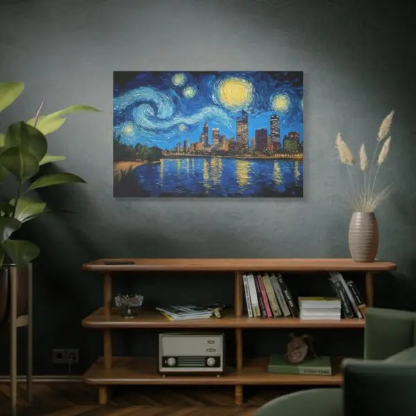 - Subject Matter: Perth cityscape at night with Van Gogh-inspired swirling skies.
